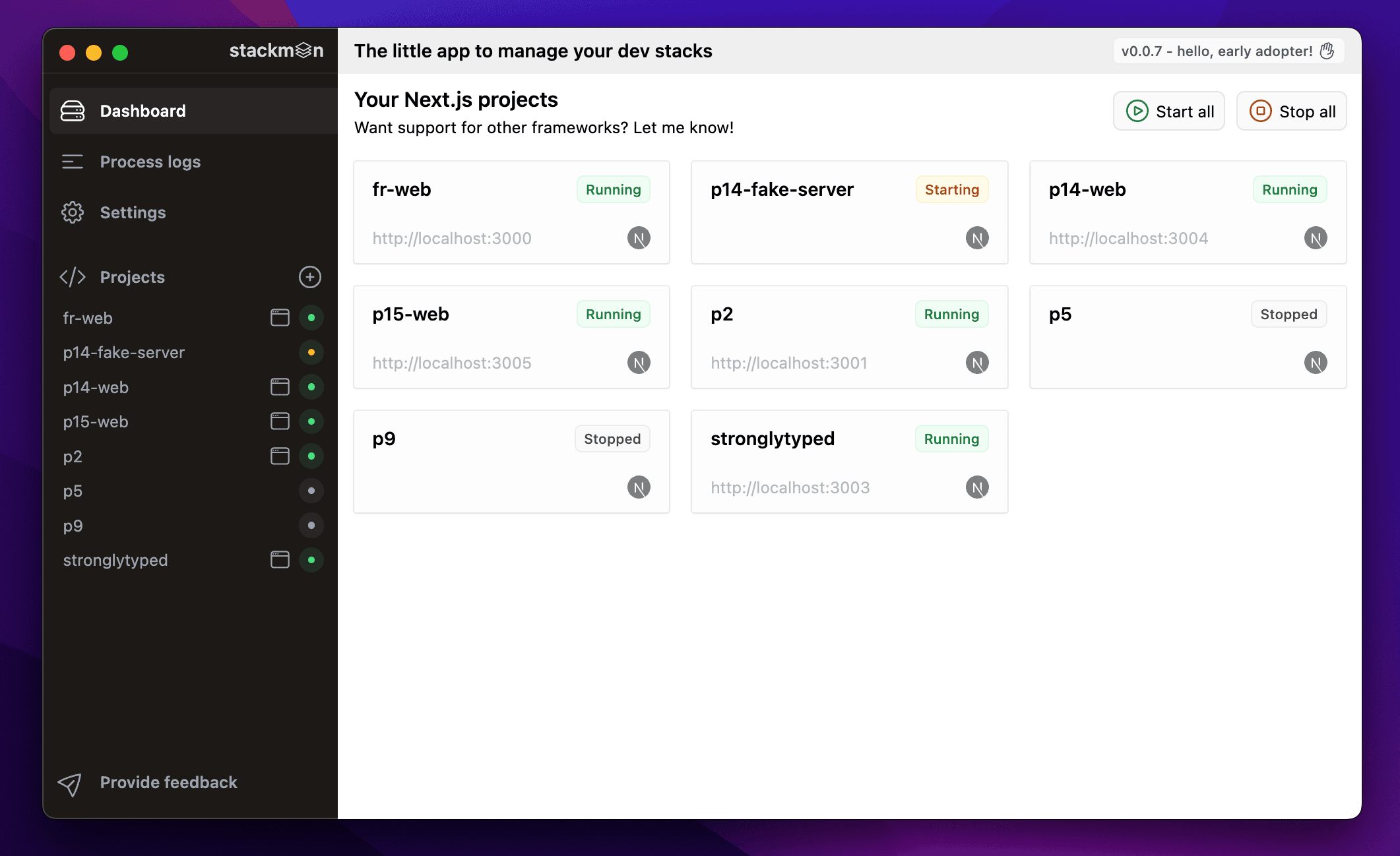 Whether you’re running two projects or twenty, and regardless of how many you typically run at once, Stackman can help. Processes will avoid port clashes and automatically restart on the last port they were listening on, even after restarting Stackman or your computer.